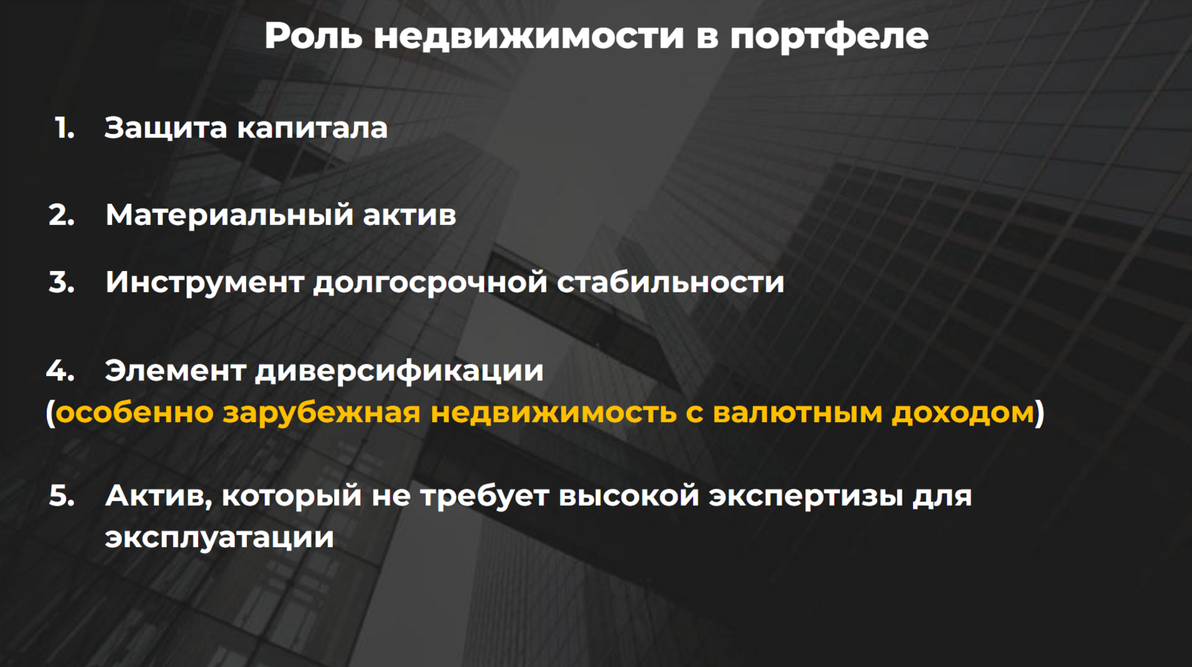 Также недвижимость выступает элементом диверсификации, особенно если речь идет о зарубежных объектах с валютным доходом. На российском рынке зарубежная недвижимость традиционно позиционируется брокерами как инструмент диверсификации: при рублевом доходе предлагается переход в дирхамы, доллары или евро как способ снижения инфляционных рисков. Предполагается, что зарубежный актив в портфеле снижает риски. Недвижимость рассматривается как актив, не требующий высокой экспертизы для эксплуатации: объект можно сдать или продать, привлекая риэлтора или агента в любой стране или городе. В целом этот инструмент воспринимается как понятный и управляемый.