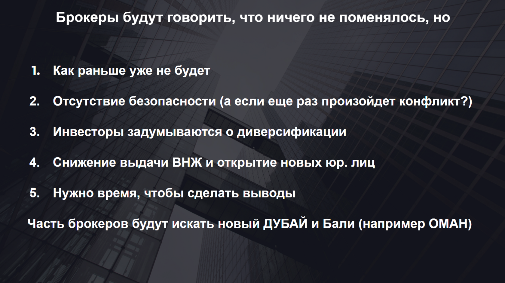 Окончательные выводы требуют времени. Подобных ситуаций регион ранее не проходил в текущем масштабе, и дальнейшая динамика станет понятна позже. Даже при быстром завершении конфликта прежнего восприятия региона уже не будет: фактор риска учтен инвесторами. Часть брокеров начнет искать «новый Дубай» — альтернативные направления. В качестве примера уже обсуждается Маскат в Омане. Вероятно перераспределение интереса в пользу более спокойных локаций, хотя регионально они также находятся в зоне общей геополитической напряженности.