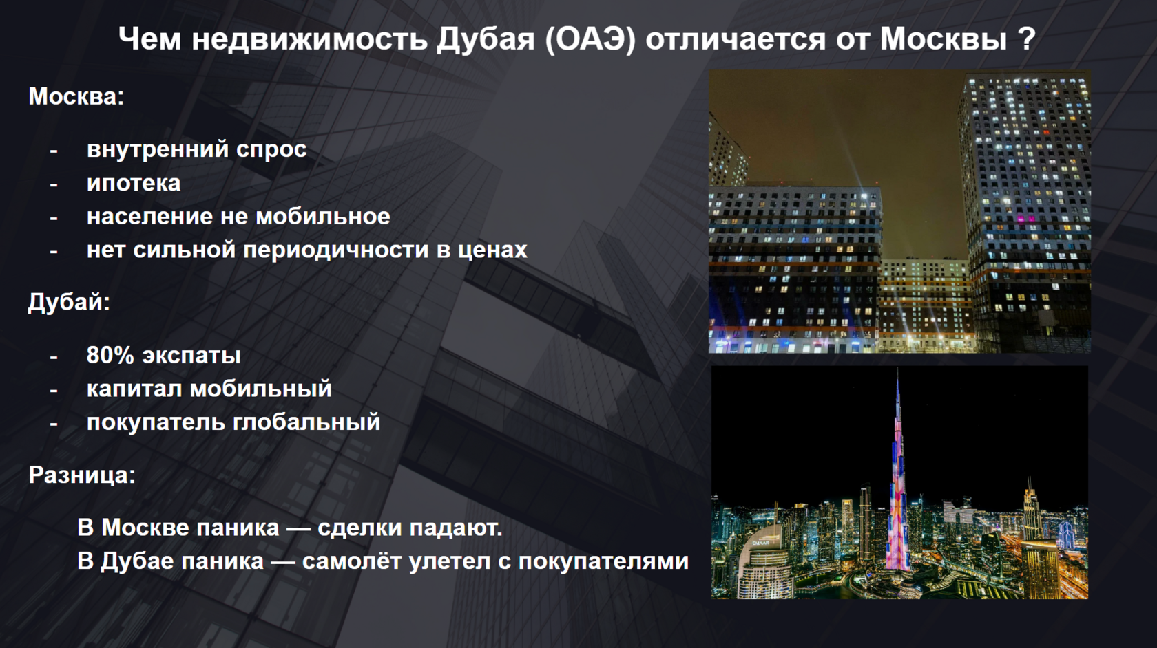 Можно спросить, чем тогда недвижимость Дубая отличается от Москвы, ведь и там, и там присутствует геополитическая напряженность. Разница фундаментальная. Москва — это внутренний спрос, ипотечный рынок, менее мобильное население. Цикличность есть, но вторичный рынок не обнуляется из-за оттока экспатов. При этом в Москве зачастую проще подобрать инвестиционный объект, воспользовавшись помощью специалистов, а также передать его в управление. В Дубае ситуация иная: значительная доля покупателей — экспаты, капитал глобальный и мобильный. Сегодня инвестор вкладывается в Дубай, завтра — в другую страну. При панике в Москве сделки могут сократиться, но физически рынок остается. В Дубае при ухудшении ожиданий самолет с покупателями может просто улететь, и это радикально меняет устойчивость модели.
