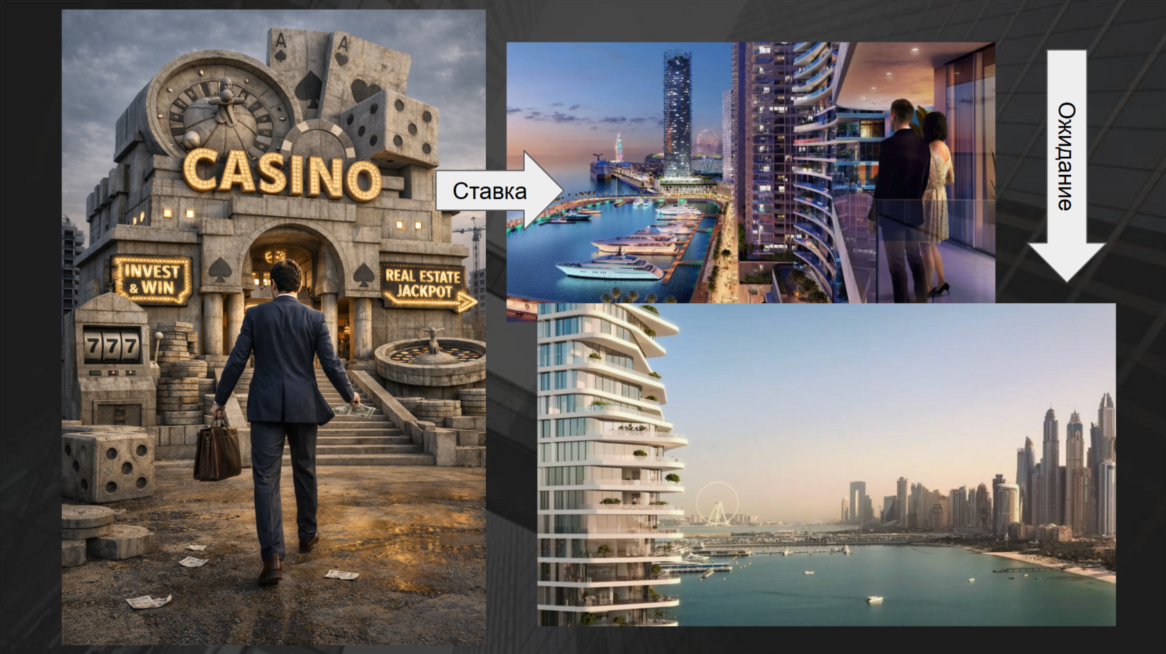 Возвращаясь к зарубежной недвижимости, именно этот сегмент во многом идеально ложится в стратегию «бетонного казино». Для выхода на зарубежный рынок, как правило, требуется значительный объем собственных средств. Ипотека в другой стране для нерезидента без дохода и статуса зачастую недоступна, поэтому инвестиция осуществляется за счет капитала. Формально существуют альтернативные способы перевода средств, однако по сути речь идет о входе с крупной суммой. Далее совершается «ставка». Зарубежный риэлтор презентует проект, демонстрирует рендеры, описывает перспективы строительства и будущую привлекательность объекта. Формируется ожидание: видовая квартира на первой линии Персидского залива, развитая инфраструктура, высокий спрос. Особенно это характерно для рынка Дубай. Возникает образ безопасной гавани.