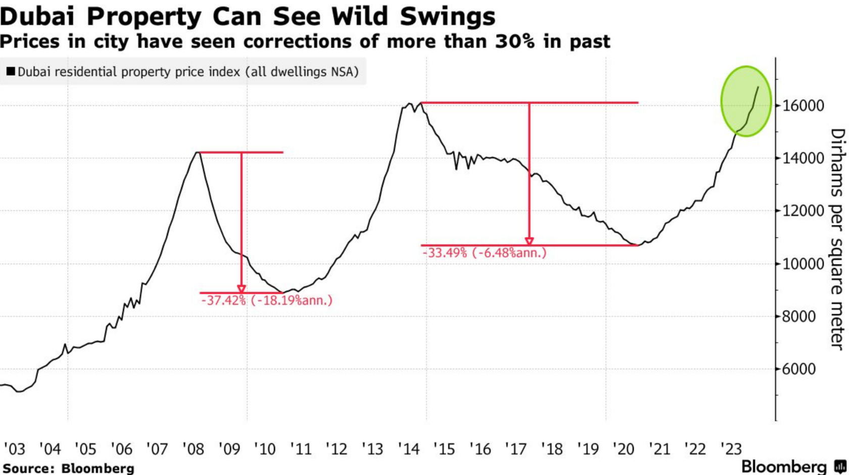 Рост во многом поддерживается верой инвесторов в продолжение притока капитала. Чем больше участников готовы вкладываться в регион, тем выше цены. Однако цены на недвижимость цикличны. По данным Bloomberg, рынок Дубая в последние годы вышел на уровни предыдущих пиков. Фактически к 2024 году цены приблизились к значениям 2014 года, после чего продолжили движение вверх. В моменте ставка делается на дальнейший рост, но цикл остается неизменным — за фазой подъема следует коррекция.