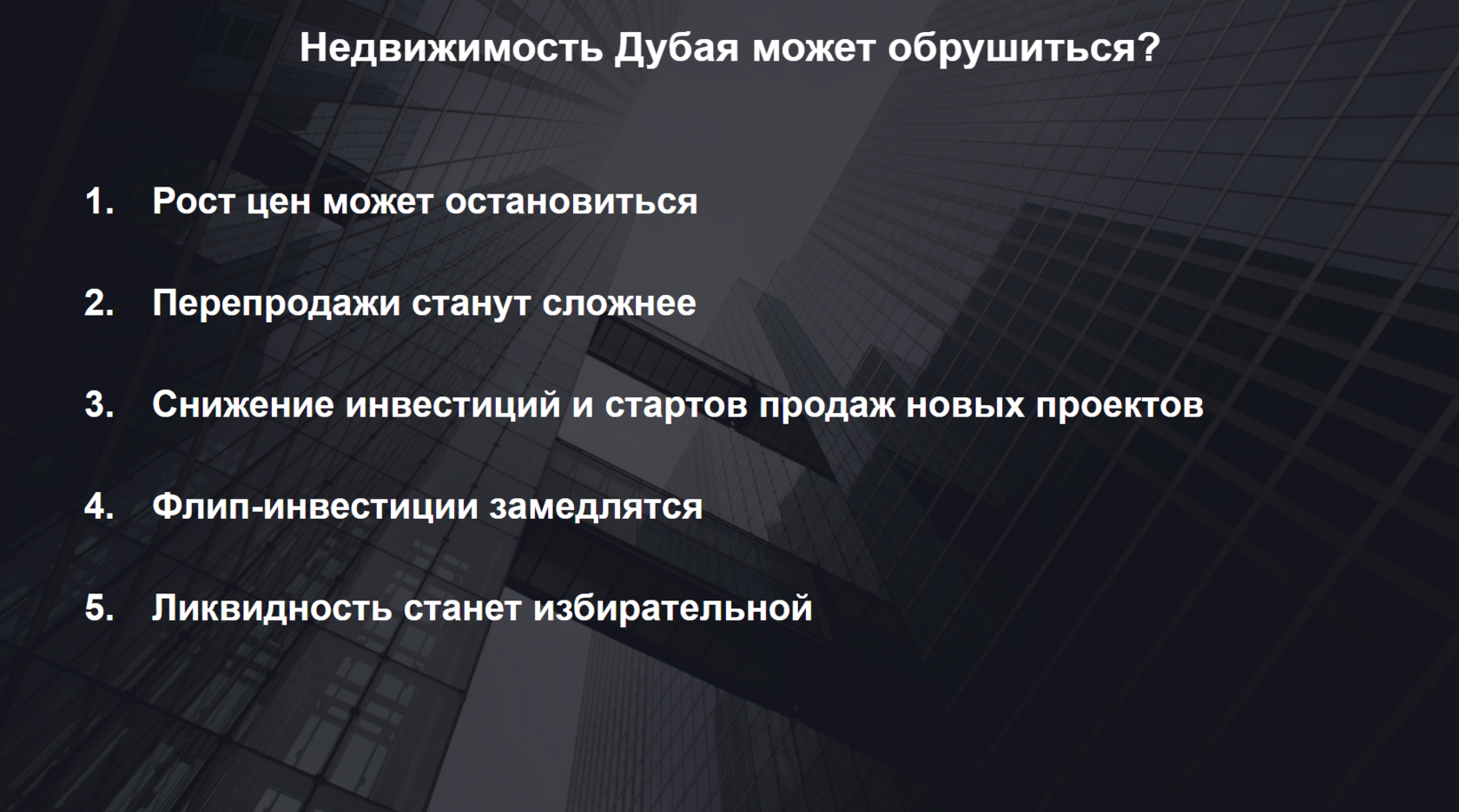 Главное — рассматривать рынок объективно, с точки зрения аналитики и макротрендов, через призму инвестора. Интерес к рынку сохраняется, однако за последние дни восприятие у многих участников изменилось. Количество запросов о срочной продаже объектов, пока они «стоят хоть каких-то денег», резко выросло. Возникает вопрос, что будет происходить с рынком ОАЭ и стран GCC далее. С высокой вероятностью рост цен может остановиться. Речь идет о динамике, которую ранее фиксировал Bloomberg. Активная фаза удорожания способна завершиться. Новых стартов продаж может стать меньше, а застройщики сосредоточатся на завершении текущих проектов, поскольку строительство во многом финансируется за счет зарубежного капитала.