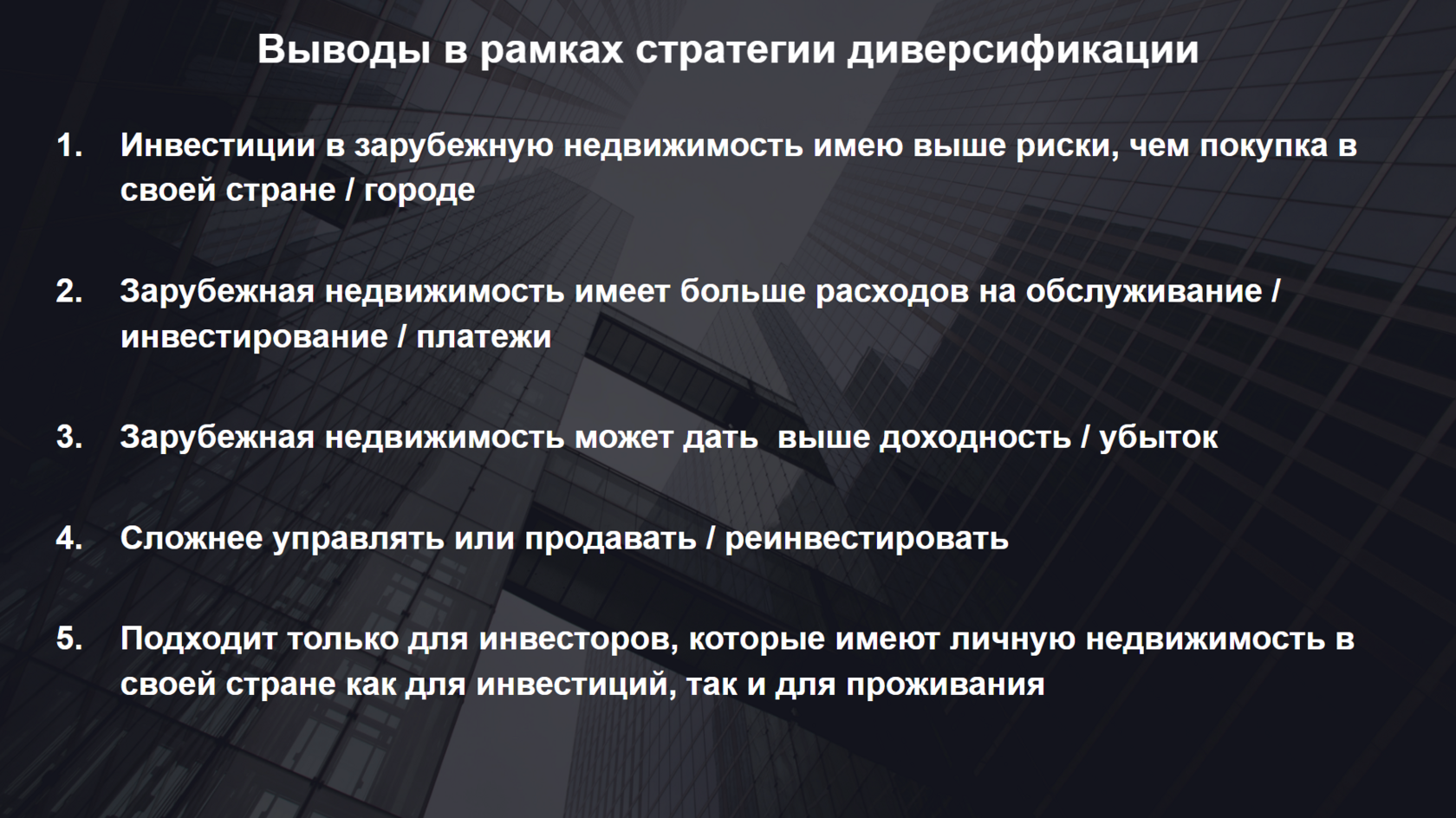 Поэтому оптимально начинать с того, что у вас уже есть личная недвижимость и хотя бы несколько объектов в портфеле, которые сдаются и приносят доход, чтобы использовать зарубежные вложения как инструмент диверсификации, а не как ставку в «бетонное казино». При этом стратегия должна строиться с учетом капитала: маленькие объемы — до 5–10 млн, средние — 10–50 млн, крупные — 50–100 млн и выше, потому что цели, возможности и подход к рискам сильно меняются в зависимости от суммы инвестиций. На этом строится логика диверсификации: сочетание локальных объектов для стабильного дохода и зарубежных для роста капитала, с ясной стратегией входа, выхода и управления рисками.