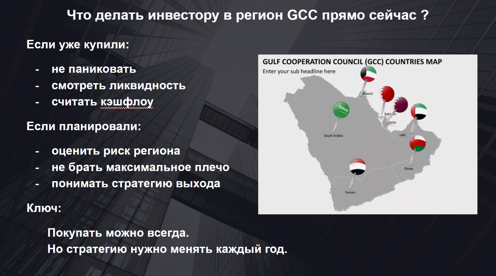 Отсюда возникает практический вопрос: что делать инвестору в регионе GCC сейчас. Если объект уже куплен, паника — худший советчик. Важно считать ликвидность, кэш-флоу, обязательства, сроки и не совершать резких действий без необходимости. Во многих случаях бездействие оказывается стратегически верным решением. Срочная продажа в момент неопределенности редко происходит на выгодных условиях. Если покупка только планировалась, имеет смысл заново оценить риск региона, смотреть шире, чем конкретный жилой комплекс или застройщик, анализировать страновой фактор, не использовать максимальное кредитное плечо и заранее понимать стратегию выхода. Покупка «дистресс-актива» имеет смысл только тогда, когда есть четкий ответ на вопрос, за счет чего цена вырастет через год или два и кому этот объект будет продан.
