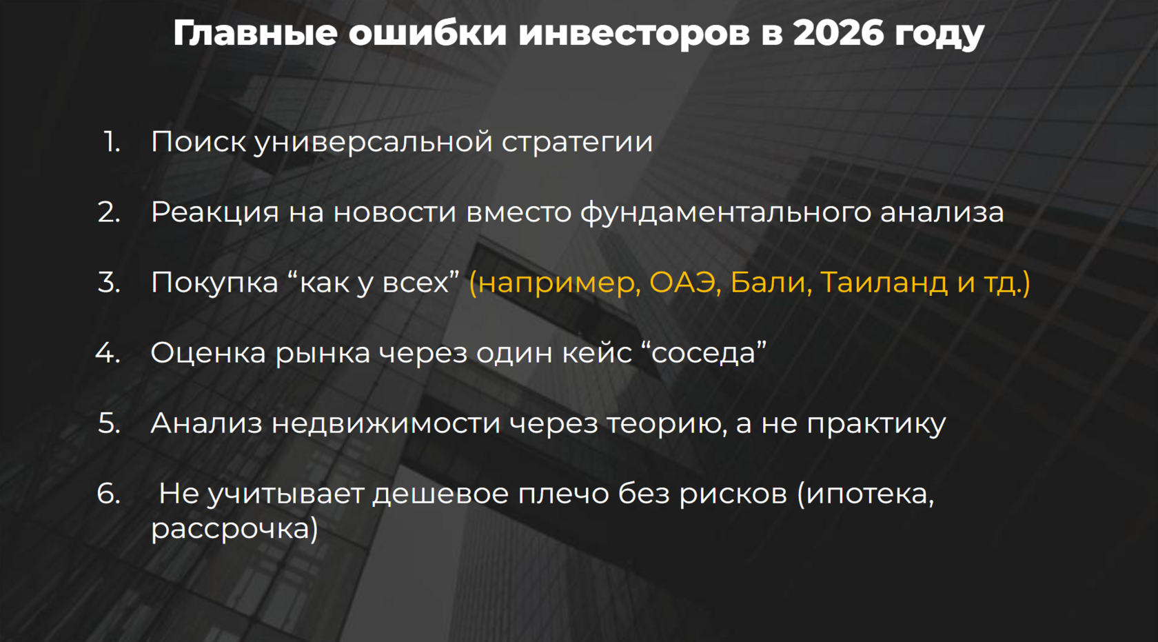 В 2026 году можно выделить шесть ключевых ошибок инвесторов, которые сохранят актуальность в ближайшие 5 лет. Первая — поиск универсальной стратегии. Часто звучит запрос: что именно купить, каким образом решить жилищный вопрос, что выбрать — рассрочку или ипотеку. Распространено убеждение, что рынок инвестиций в недвижимость рухнул или инвестировать без льготной ипотеки невозможно. Это заблуждение, поскольку инвестиции в недвижимость не сводятся к инструменту льготной ипотеки и предполагают совершенно иные бюджеты и расчеты. Вторая ошибка — реакция на новости вместо фундаментального анализа. События в странах GCC, особенно в Дубай, вызывают у собственников вопросы о срочной продаже объектов. Подобные решения принимаются на фоне эмоций и паники, без системного анализа и оценки рисков. Третья ошибка — покупка «как у всех». В определенный период было модно приобретать недвижимость на Бали, в Таиланде или в Дубае, и сам факт владения воспринимался как показатель статуса. Происходит копирование чужих стратегий. Именно поэтому механика автоследования, популярная у части инвесторов, не работает в недвижимости: у каждого собственника индивидуальные цели и задачи.