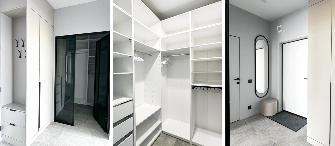 Клиентка хотела полупрозрачную дверь, интегрированную в дизайн так, чтобы она, с одной стороны, скрывала содержимое, а с другой не скрадывала пространство. В магазинах такого решения просто не существовало. Мы подключили подрядчика, проработали чертежи, согласовали детали, контролировали все этапы. Итог стоил того: дверь стала частью композиции и подчеркивала стиль квартиры. Встроенные системы хранения тоже делались индивидуально. Это кажется мелочью, но именно такие вещи делают пространство удобным, избавляют жильцов от «визуального шума» и создают ощущение дорогого интерьера.