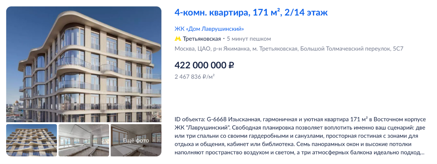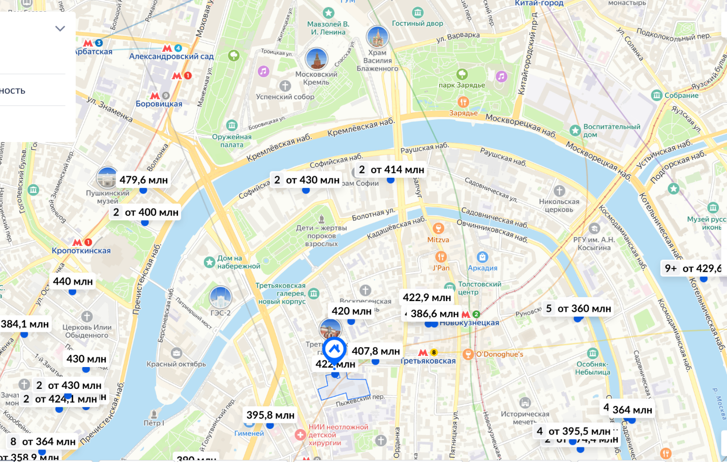 Лаврушинский расположен в шаговой доступности от центра: рядом Кремль, станция Третьяковская, Новокузнецкая и Полянка. Однако если смотреть что-то более доступное — примерно за те же 2,5 млн руб. за квадратный метр — статистика показывает, что можно найти варианты стоимостью около 422 млн руб., то есть 0,4 млрд.