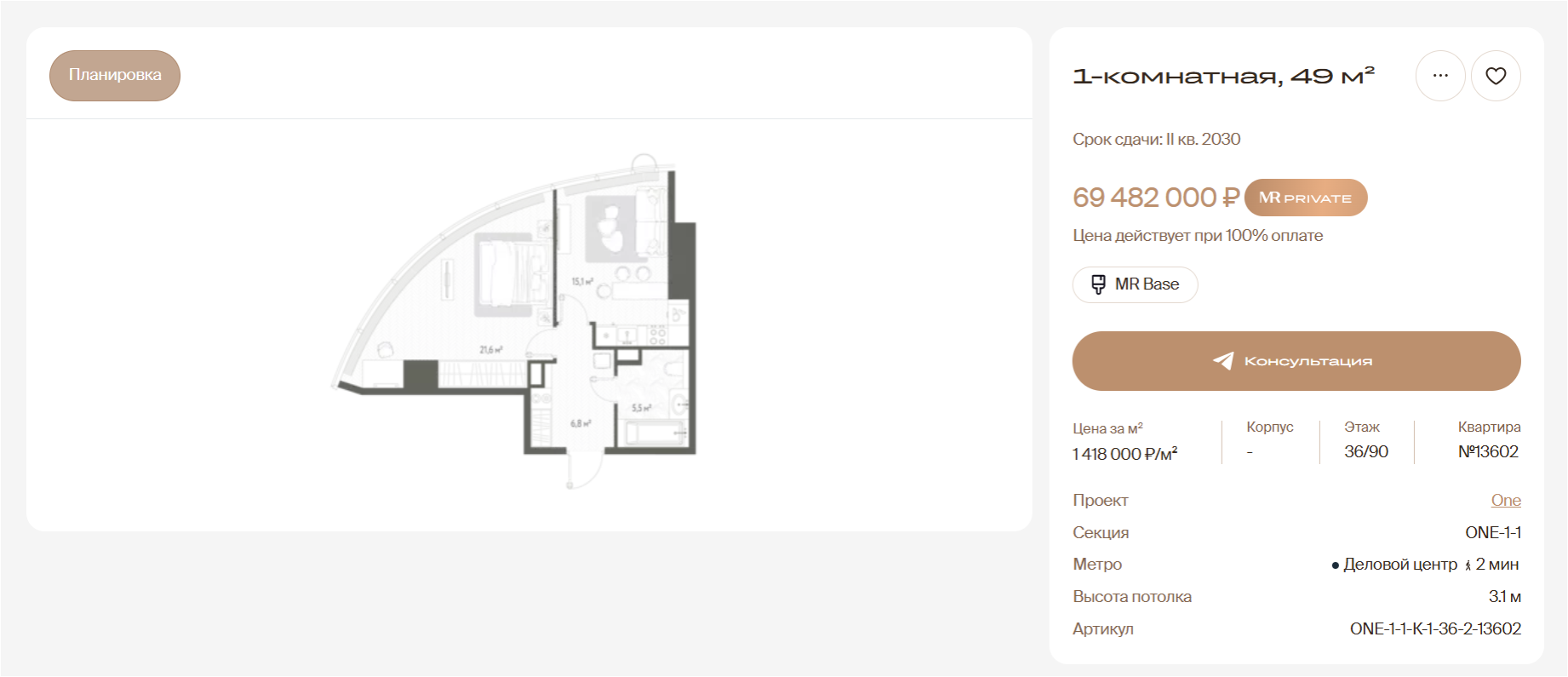 Результат уже есть: сейчас подобные квартиру, но на более низких этажах стоят уже почти 70 млн ₽, и их мало, то есть мы практически за месяц получили прирост стоимости более 20 млн! С учетом локации, вида и качества проекта, ждем цену на ключах в 2030 году 2,5 млн ₽ за метр, то есть квартира может подорожать до 100 млн ₽.