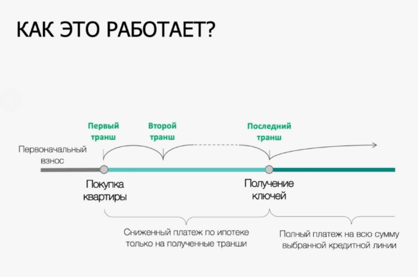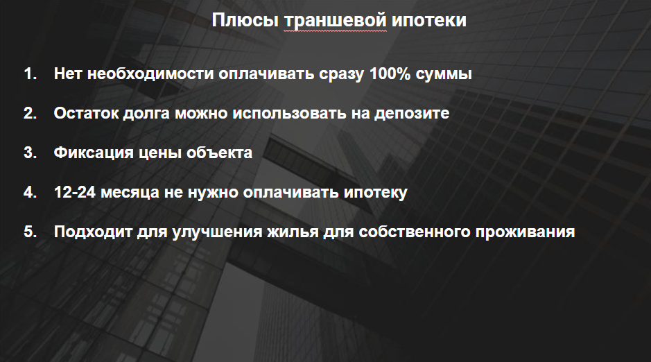 Такой подход особенно популярен среди тех, кто сейчас снимает жилье или живет в собственной квартире, но не может одновременно платить и ипотеку, и аренду. Чтобы не нести двойную финансовую нагрузку, застройщик предлагает оформить покупку: внести первоначальный взнос, зафиксировать стоимость объекта, оформить ипотеку формально, но без реальной выплаты большой суммы. Например, человеку требуется ипотека на 10 млн руб., но первый транш выдается лишь в размере 1 тыс. руб., а оставшиеся 9,999 млн руб. поступают уже при получении квартиры.