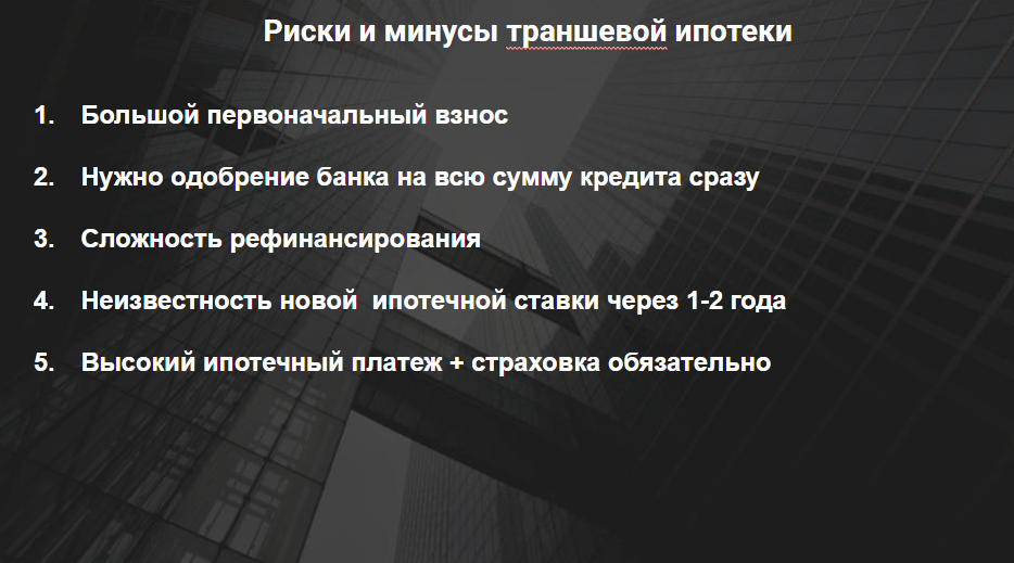 Главный риск траншевой ипотеки заключается в том, что многие заемщики не осознают, что через год им предстоит платить по 200 тыс. руб. в месяц. Люди же нередко соблазняются на «легкий» старт с платежом в 2 тыс. руб., не думая о будущем. Некоторые воспринимают такую схему как возможность быстрой спекуляции: купить квартиру за 19 млн руб., продать за 25 млн и заработать 5 млн, рассчитывая на доходность около 50% годовых, но это заблуждение. Такая стратегия крайне рискованна и подходит далеко не всем. Траншевая ипотека уместна, если у покупателя уже есть значительная сумма или он планирует продать другой объект недвижимости, чтобы погасить долг. В таких случаях схема действительно может быть выгодной. Однако требуется крупный первоначальный взнос, банк должен одобрить кредит на всю сумму сразу. Также могут возникнуть трудности с рефинансированием.