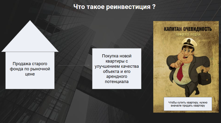 Но если говорить о самом популярном механизме, то это, конечно, покупка через реинвестицию. Схема проста: у человека есть старая квартира, например, стоимостью 10 млн руб. Он продает ее, добавляет ипотеку в размере 5 млн и покупает новую — за 15 млн руб. Идея очевидна: чтобы купить новую квартиру, нужно сначала продать старую.