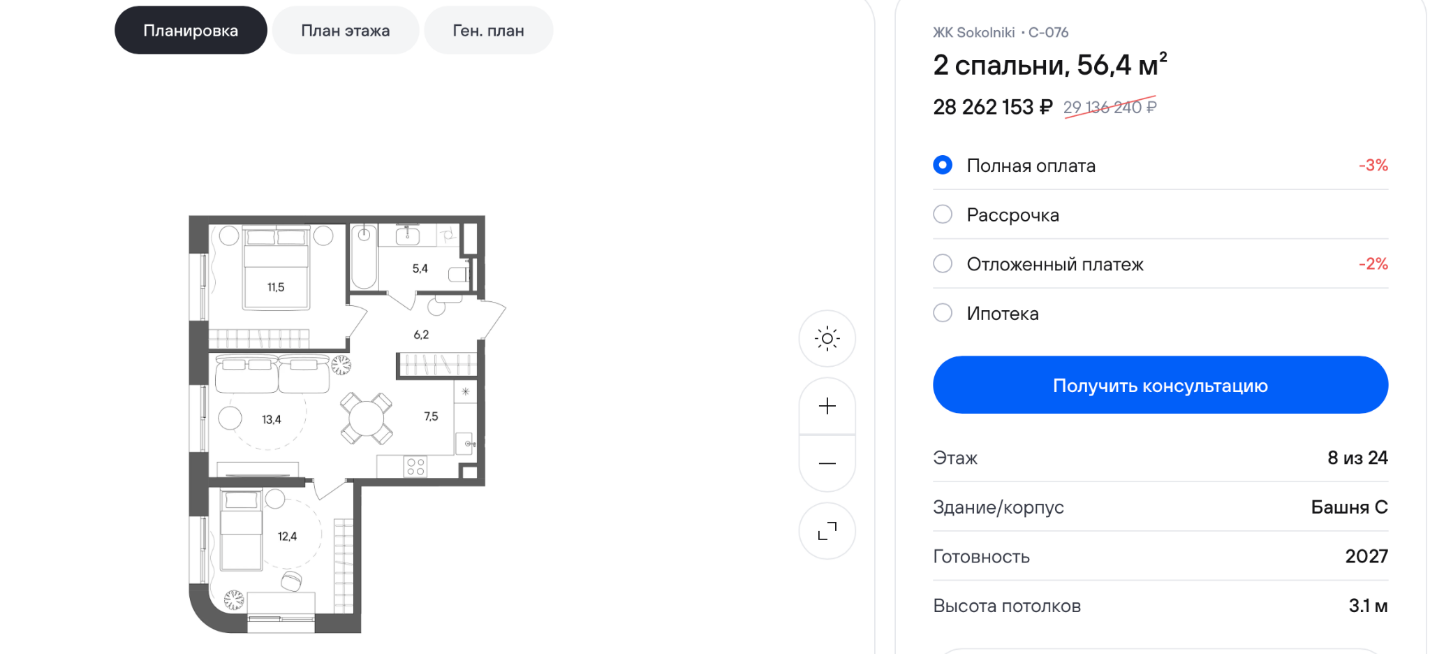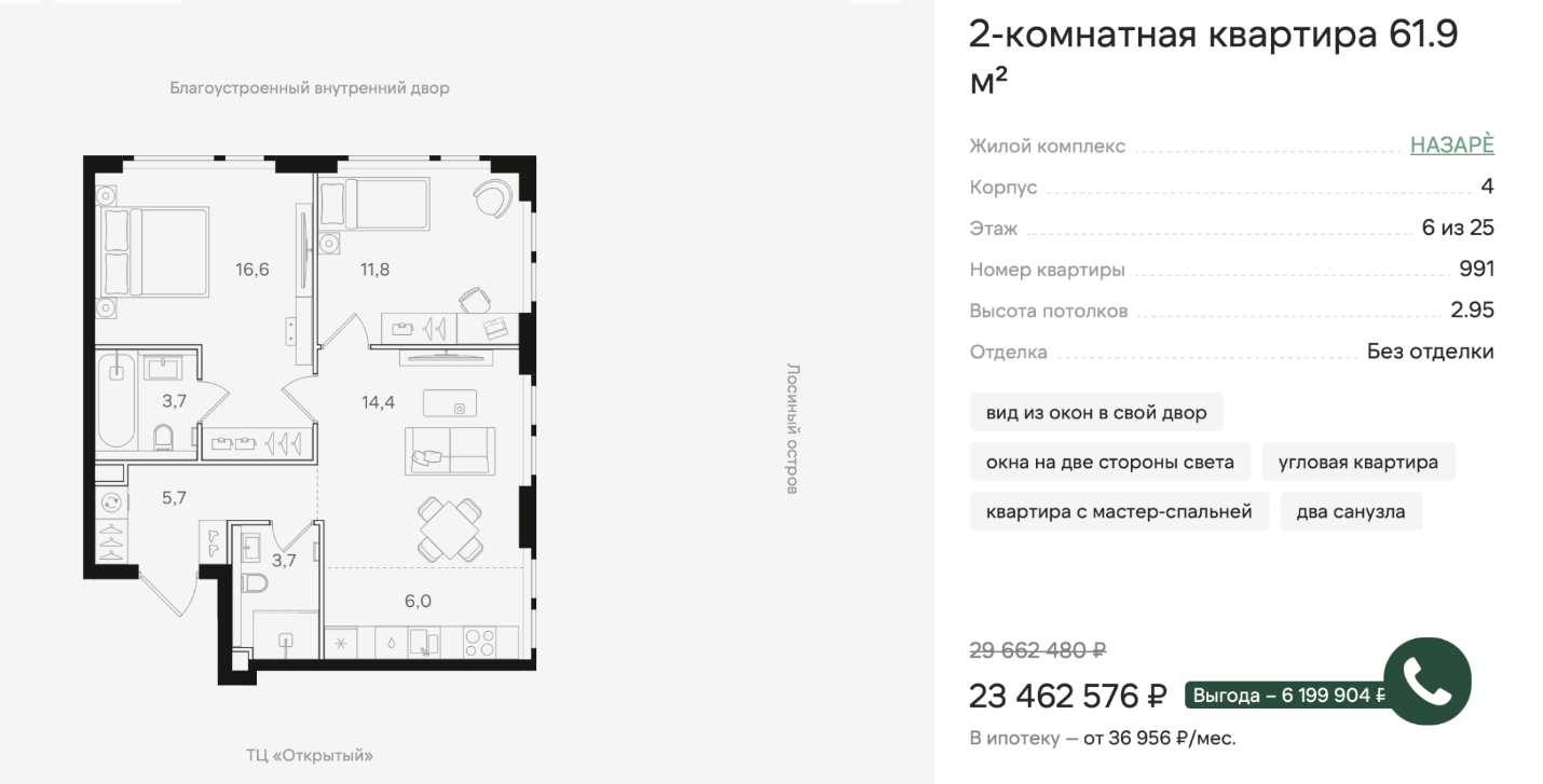 И если посмотреть, допустим, двухкомнатную квартиру площадью 62 м² с хорошей планировкой — два окна, угловая, удачная компоновка — то видно, что застройщик постарался, и планировка действительно достойная. Цена такой квартиры — 24 млн руб. Чтобы купить ее по семейной ипотеке, нужно примерно 5 млн руб. собственных средств, остальное в кредит: из 19 млн ипотечных 12 будут по семейной ставке, а 7 — по рыночной. Вот примерно так и формируется покупка. Осталось найти 5 млн взноса и одобрить ипотеку.