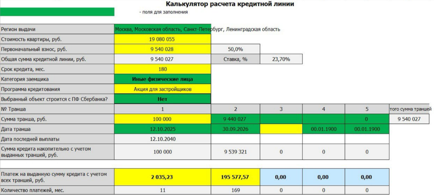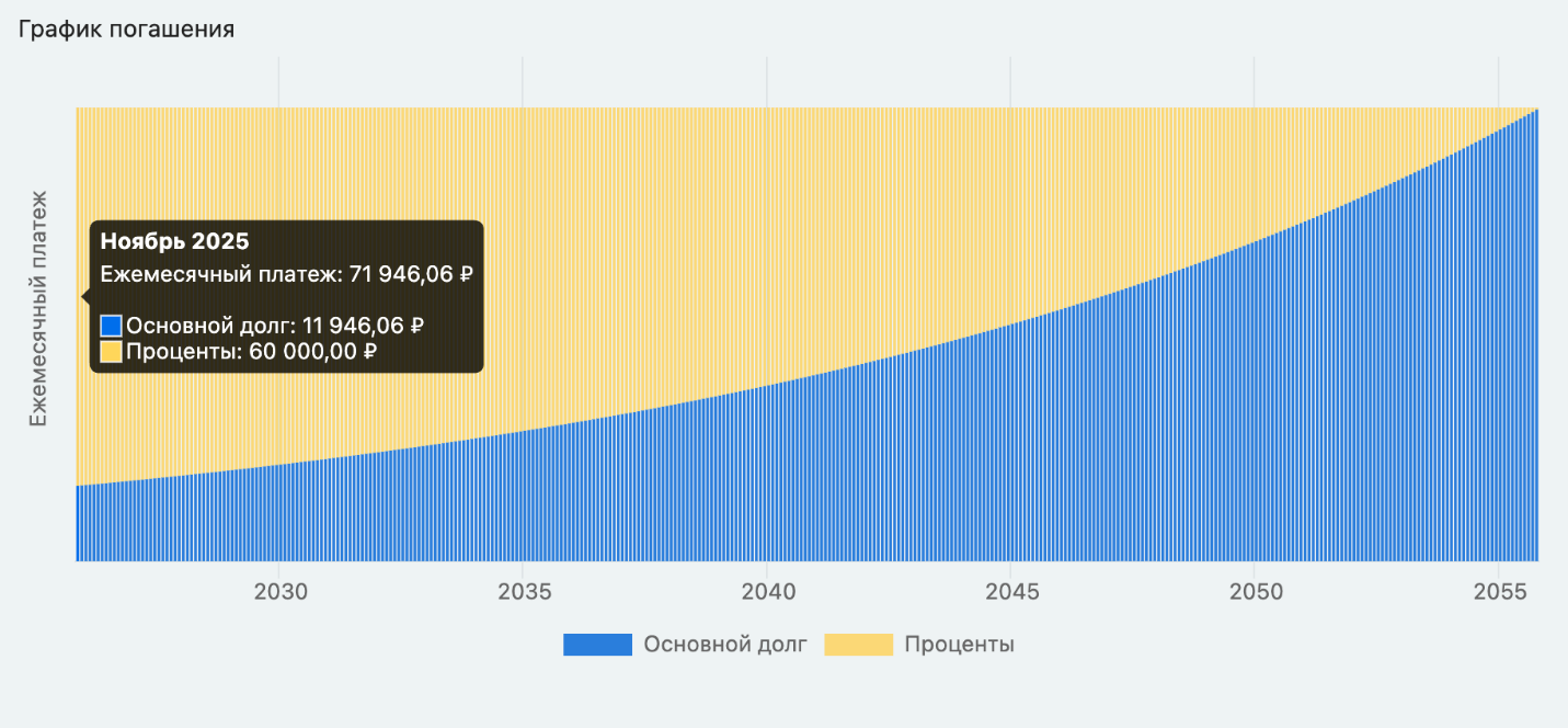 При этом первый транш составляет не 1 тыс. руб., а 100 тыс. руб., а остальная часть — 9,44 млн руб. — будет перечислена, например, 30 сентября 2026 года. Это значит, что в течение года после оформления договора покупатель фактически не выплачивает ипотеку в полном объеме: его ежемесячный платеж составляет лишь около 2 тыс. руб. на протяжении 11 месяцев. А начиная с октября 2026 года, платеж увеличится до 195 тыс. руб.
