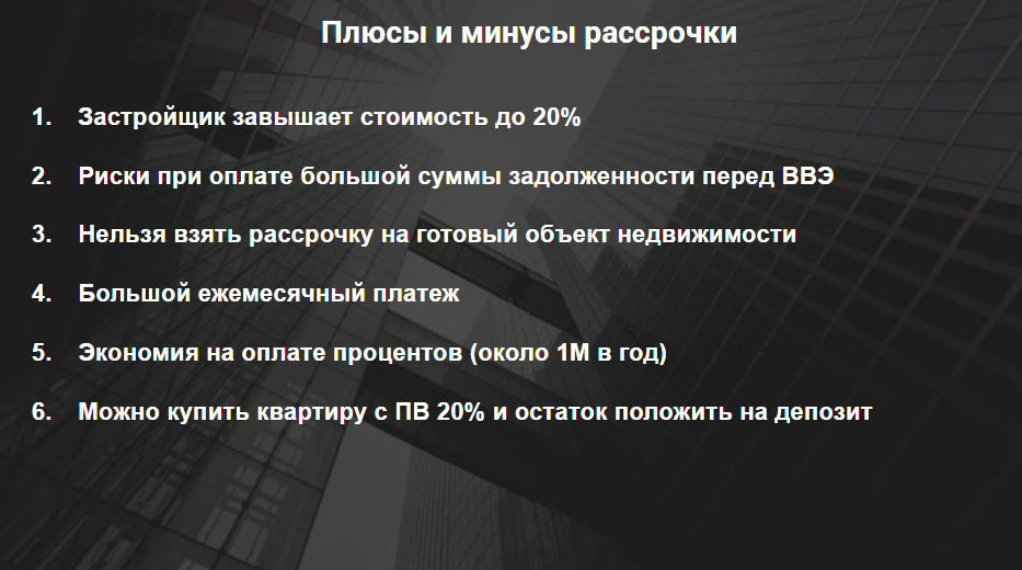 Рассрочка предполагает более высокий ежемесячный платеж по сравнению с ипотекой, однако отсутствие процентов делает этот инструмент финансово привлекательным. Кроме того, рассрочка позволяет использовать гибридные стратегии — например, внести 20% стоимости квартиры, а оставшиеся средства разместить на депозите или инвестировать в другие инструменты.
