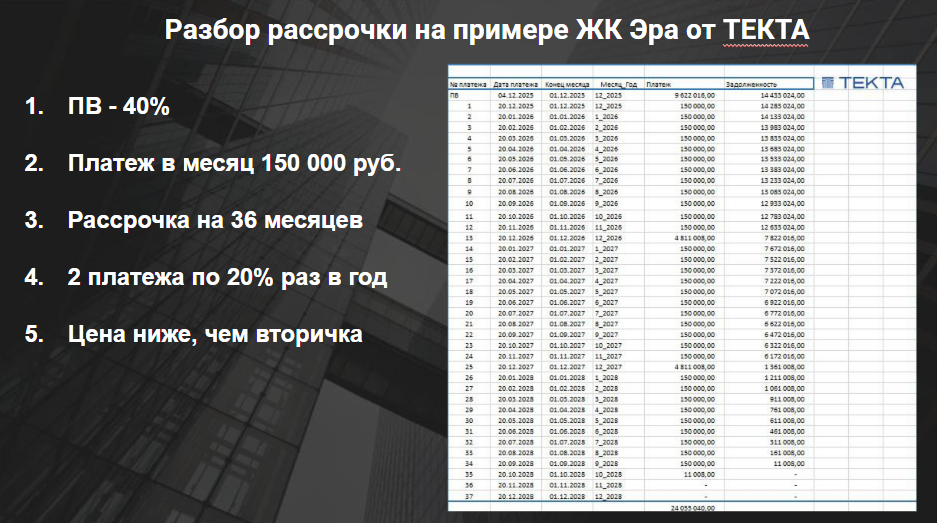 На старте продаж стоимость аналогичной квартиры составляла 24 млн руб. При этом застройщик предлагал рассрочку с первоначальным взносом 40%. В пересч ете это примерно 9 млн руб. и ежемесячные платежи по 150 тыс. руб. В отличие от ипотеки, где основная часть ежемесячного платежа уходит на проценты, в рассрочке средства направляются на погашение тела долга. Для сравнения: в семейной ипотеке при платеже 72 тыс. руб. около 60 тыс. составляют проценты, и за год долг уменьшается всего на 150 тыс. руб. В рассрочке структура обратная — плат еж выше, но он сразу ид ет в сч ет стоимости квартиры.