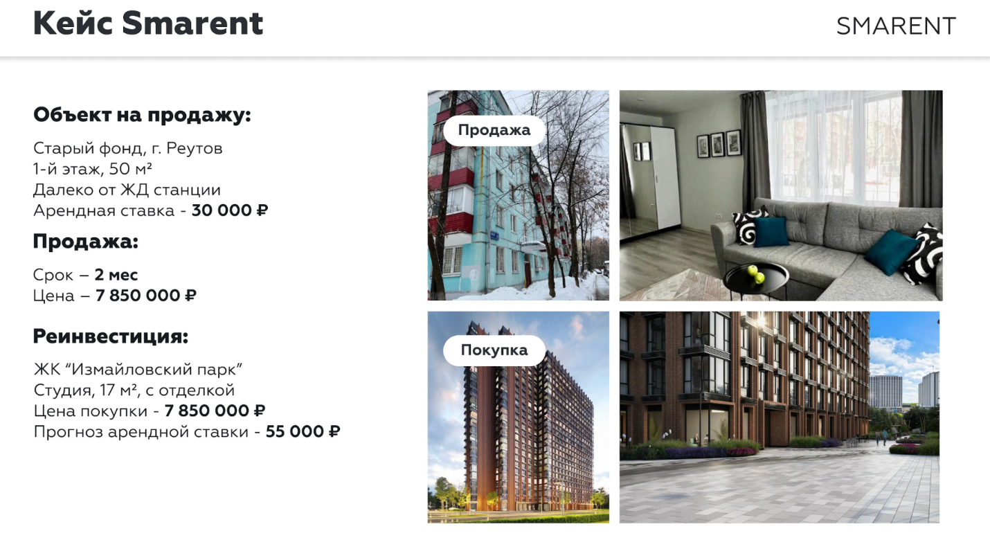 Другой пример — квартира в Реутове, где старый фонд за 7,8 млн продан, на вырученные деньги куплена студия в новом комплексе у Измайловского парка, которая сегодня стоит около 10 млн руб. и сдается за 55–65 тыс. руб. в месяц.