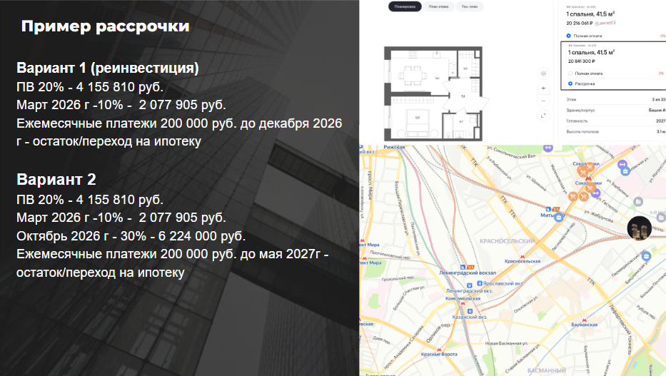 Именно поэтому покупатели с капиталом нередко выбирают рассрочку, фиксируют цену объекта, вносят часть суммы и постепенно выплачивают остаток, сохраняя при этом возможность использовать свой капитал в других направлениях. При росте рыночной стоимости квартиры до 30–35 млн руб. выгода становится очевидной — сохраняется капитал и одновременно фиксируется привлекательная цена на входе. Покупка же объекта за полную сумму в кэш при долгом сроке строительства, наоборот, выглядит экономически невыгодной. В таких случаях рассрочка становится оптимальным инструментом, позволяющим распределить расходы во времени и эффективно управлять собственными средствами.