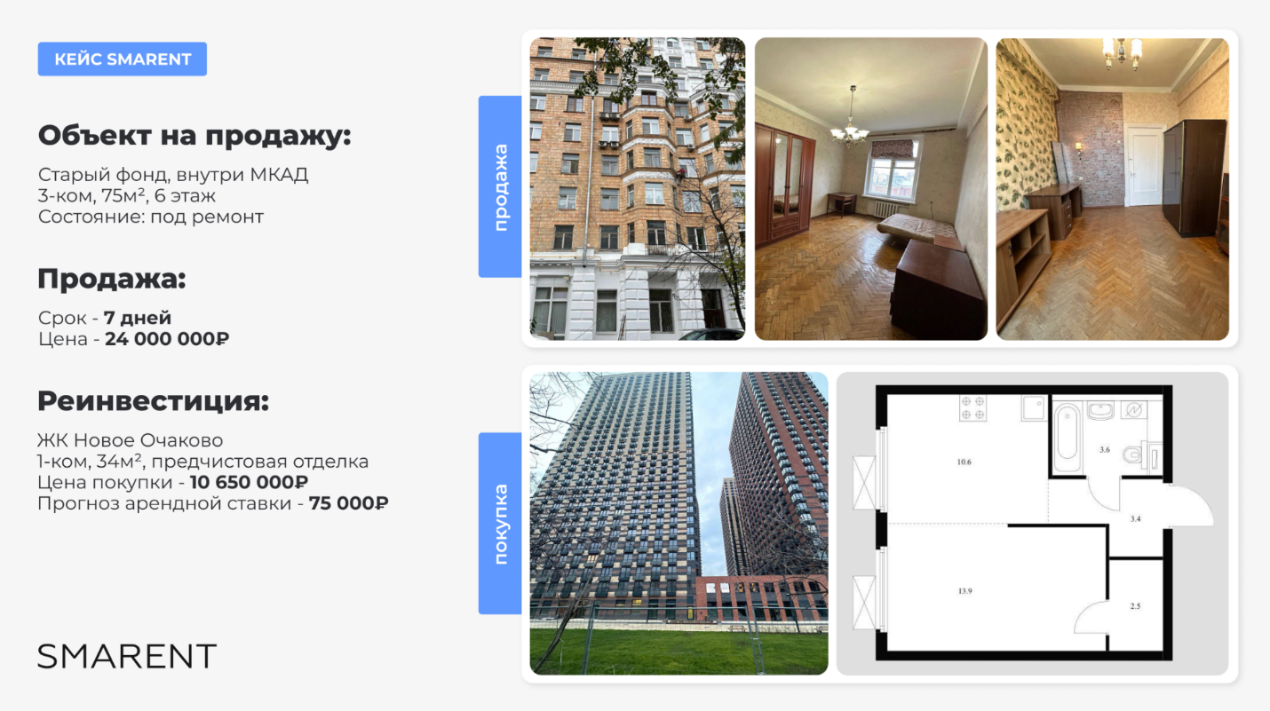 Кстати, пример того, откуда можно было бы взять 10 млн руб., тоже понятен. Если бы несколько лет назад вы купили студию от застройщика в льготную ипотеку, получили ключи, сделали грамотную меблировку, которую выполняет компания Smarent, и сдали или продали этот объект, то сегодня могли бы выручить около 10 млн руб. и направить эти деньги дальше — в покупку более просторной квартиры для себя. Все зависит от стратегии.