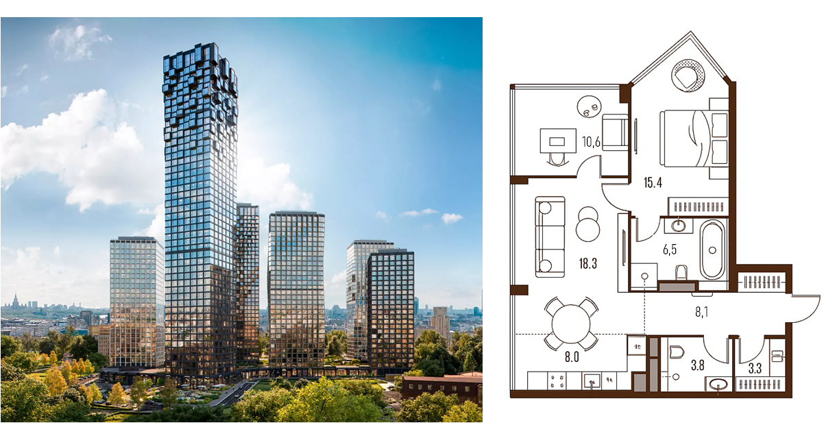 Казалось, что идеального решения нет. Но мы решили немного снизить планку и заглянуть в сегмент «премиум», тем более что деление на «премиум» и «элит» весьма условно. И именно здесь мы нашли нашего победителя: проект High Life в районе Павелецкой. Почему именно он? Тут все сложилось. Мы нашли квартиру евро-3, а этот формат в премиальном сегменте Москвы всегда в дефиците. Плюс чистовая отделка и виды, которые действительно «продают»: панорама на Москва-Сити и центр столицы. Но главное – ценник.