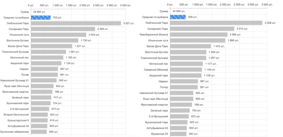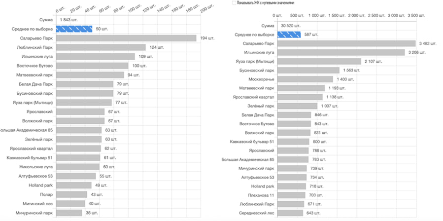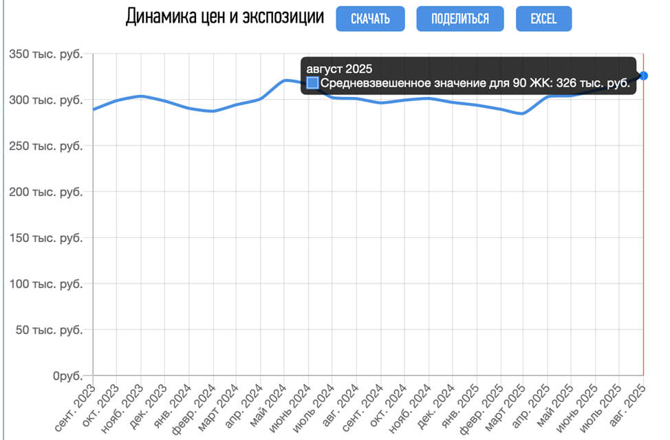 Средние цены также показали рост. Если в сентябре 2023 года средняя цена была около 280 тыс. за квадратный метр, то сейчас — 326 тыс. Это рост примерно на 16–17%. Любой аналитик разделит это на два года и получит 8% годовых. Однако такой расчёт некорректен, так как смешивает разные проекты — от «Никольских лугов» и «Саларьево парка» до «Бунинских лугов» и «Мичуринского».