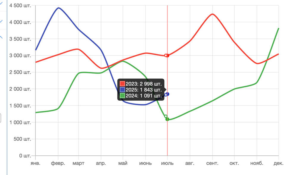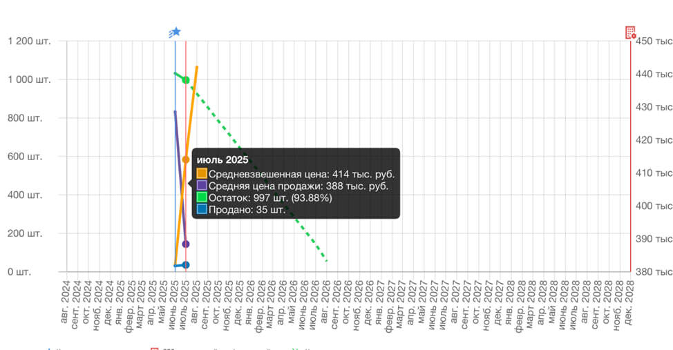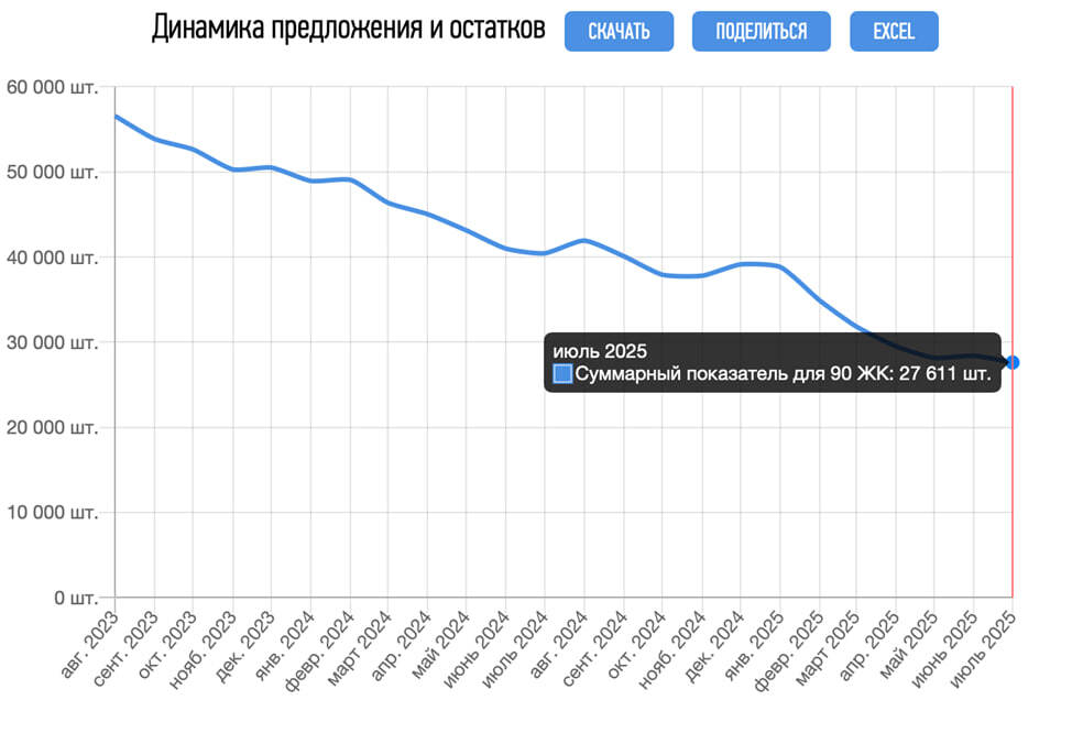 Динамика предложения и остатков подтверждает это. В августе 2023 года она составляла около 56 000 квартир. На июль 2025 года — те самые 27–30 000. Цифра может снижаться дальше. Проблемы избытка неликвидной недвижимости при текущем плане продаж нет.