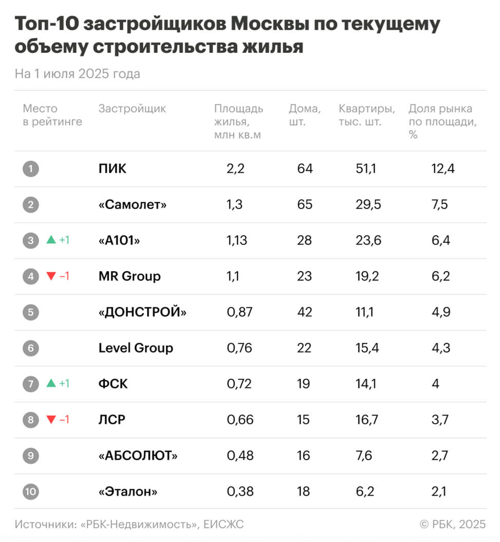 Анализ данных по Москве показывает интересную расстановку сил в сфере жилищного строительства. Если исключить из рейтинга Фонд реновации, то первые места в топ-10 застройщиков столицы занимают привычные девелоперы: ПИК, Самолет, А101, МР Групп, Дострой, Level, ФСК, ЛСР, Абсолют и Эталон. Безусловным лидером с долей рынка 12% по площади остается застройщик номер один — ПИК. Для сравнения, объемы строительства таких компаний, как Level или ФСК, примерно в три раза меньше.