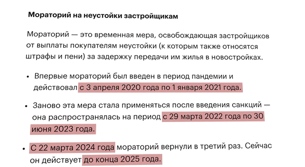 Почему государство ввело такую «халяву» для строителей? Потому, что предписанная законом неустойка настолько велика, что ее массовая выплата просто разорила бы многих застройщиков. Кто-то скажет: «Это бизнес-риски». Но на кону — судьбы тысяч людей. Банкротство застройщика оставляет дольщиков у разбитого корыта: без ключей и без квартир. Да, есть страхование через эскроу-счета, и деньги вернули бы. Но кому нужны деньги, если за годы строительства рынок вырос, а люди все это время платили ипотеку? Дольщикам нужны именно квартиры. 2Таким образом, мораторий был вынужденной мерой, чтобы крупные неустойки не вогнали застройщиков в долги и банкротство, сохранив шансы людей на получение жилья.