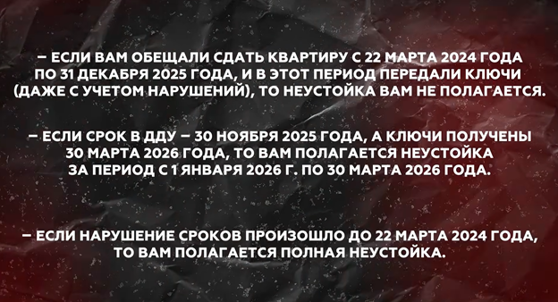 Правила начисления и выплаты можно объяснить следующим образом: если передача ключей произошла в период действия моратория (22.03.2024 – 31.12.2025), неустойка не начисляется. Также если по ДДУ срок сдачи был, например, 30 ноября 2025 года, а ключи получены 30 марта 2026 года, неустойка начисляется строго за период с 1 января по 30 марта 2026 года. При нарушении сроков сдачи, установленных до 22 марта 2024 года, неустойка подлежит выплате, но произойдет это только в 2027 году.