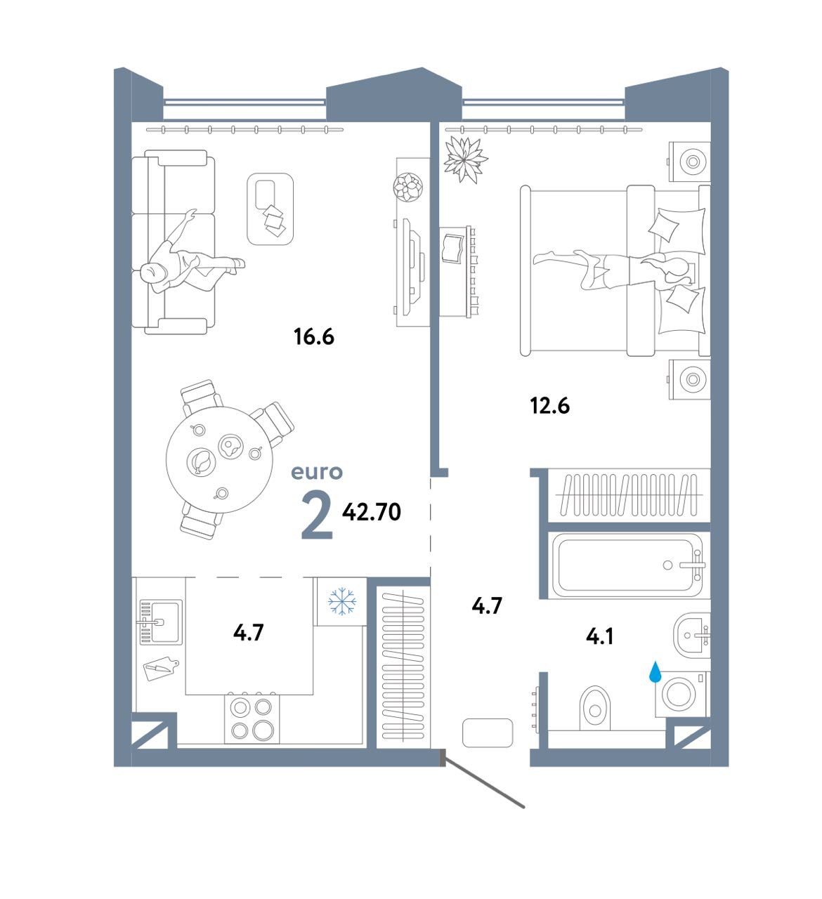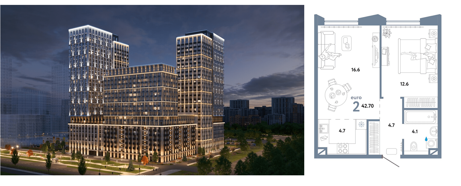Обе квартиры были евро-двушки большой площади – около 42 кв. метров: цена одной составила 17,8 млн, другая обошлась в 18 млн. Сроки передачи ключей тоже устроили: сдача дома летом 2026 года. Ремонт семью не пугал, к тому же при передаче квартир в управление Smarent мы часто помогаем со всеми этапами: от приемки, до отделки, меблировки и аренды – под ключ.