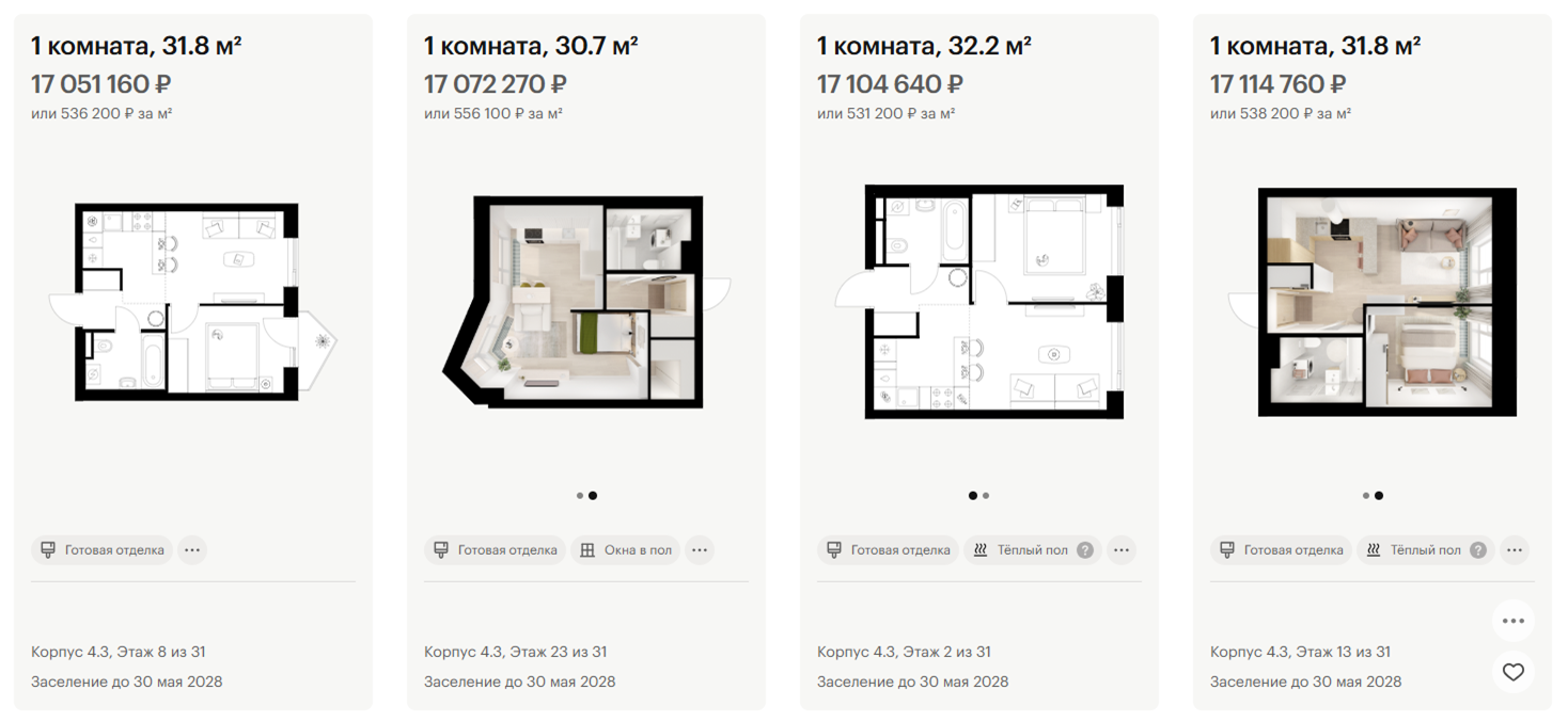 На первоначальный взнос клиенты накопили 12 млн ₽, плюс две семейные ипотеки, то есть примерно по 18 млн на квартиру. Такой бюджет позволяет рассматривать уже бизнес-класс: этот класс жилья существенно лучше ведет себя с возрастом, чем комфорт. К тому же важно было вложиться так, чтобы локация и потенциал роста не вызывали сомнений. Именно поэтому на первой встрече с клиентами мы так дотошно разбираем реальные цели и стратегии: одни проекты лучше работают на коротком горизонте, другие – на более длинной дистанции, поэтому подбор всегда зависит от целей конкретных клиентов.