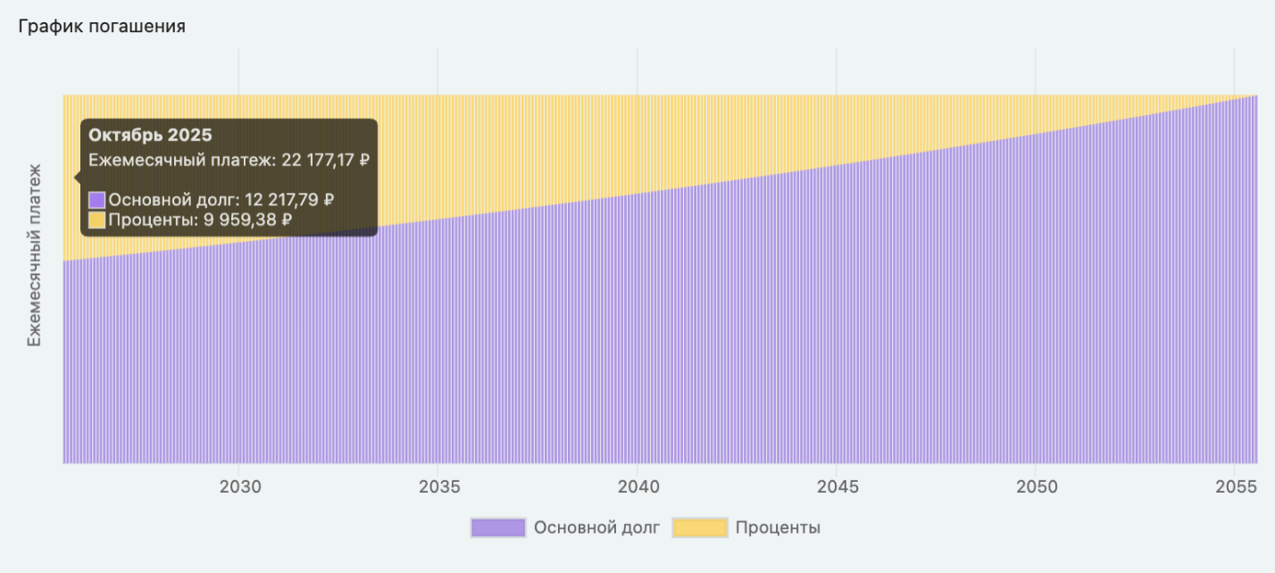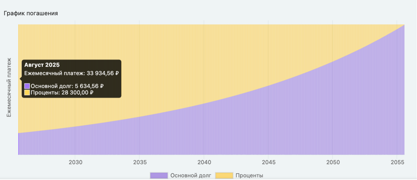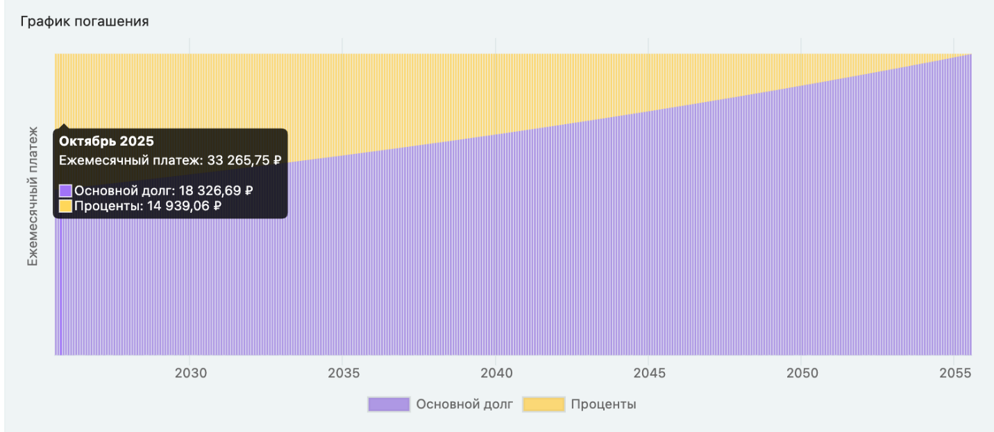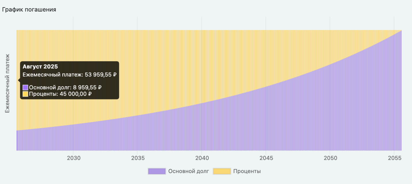 Стандартный расчет по IT-ипотеке: кредит на 9 млн рублей под 6% годовых. Ежемесячный платеж составит около 60 тысяч рублей, из которых примерно 45 тысяч в первые годы — это проценты. Годовая переплата — порядка 500 тысяч рублей.