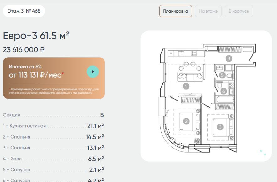 Первоначальный взнос 30% и субсидированная ставка 8% на 3 года от банка МКБ. Конечно, будет страховка, но у МКБ она не такая космическая, как у других. Квартира стоит 23 млн рублей. При взносе 30% (около 7 млн рублей) тело кредита составит 16 млн рублей. Платеж по ипотеке под 8% годовых на этот срок будет чуть больше 100 000 рублей в месяц.Это очень выгодное предложение на старте. После трех лет ставка, конечно, вырастет, но ее всегда можно рефинансировать в другом банке на более выгодных условиях. Либо, если цель — спекуляция или перепродажа, квартиру можно будет продать и закрыть кредит досрочно.