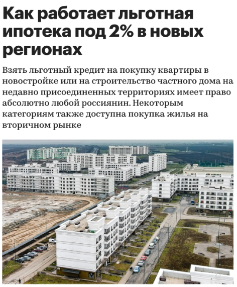 На данный момент все это — скорее слухи и предположения. Но вероятность того, что такую ипотеку действительно введут или хотя бы сделают доступной в ближайшее время — очень высокая. И скорее всего, она будет распространяться именно на тот регион, где прописан участник СВО — иначе многие начнут массово покупать квартиры в Москве или Петербурге вместо своих родных регионов.