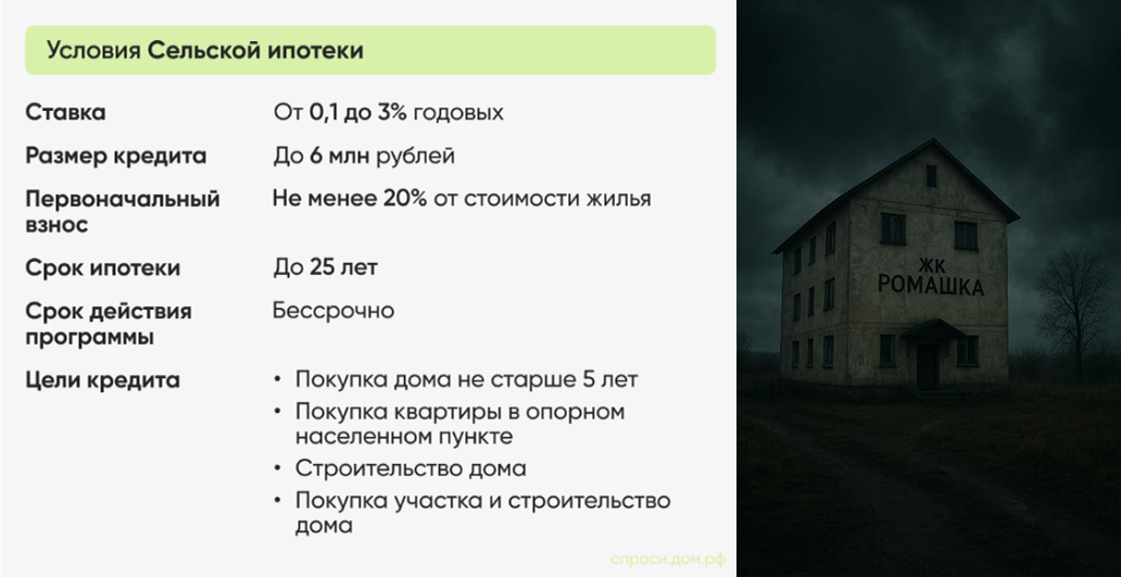 Получить ее довольно сложно, и выдают ее строго в сельских регионах. Условия, на первый взгляд, очень привлекательные: ставка всего до 3%, максимальная сумма — 6 млн рублей, а срок кредитования — до 25 лет. Однако ключевое ограничение заключается в целях: эти деньги можно направить строго на строительство жилья (покупка участка с последующей застройкой) или на покупку готового дома, но не старше 5 лет. Можно купить и квартиру, но только в опорном населенном пункте — это территории вне городских агломераций, где активно строят дороги, школы, магистрали. Сам дом при этом должен быть не выше пяти этажей.