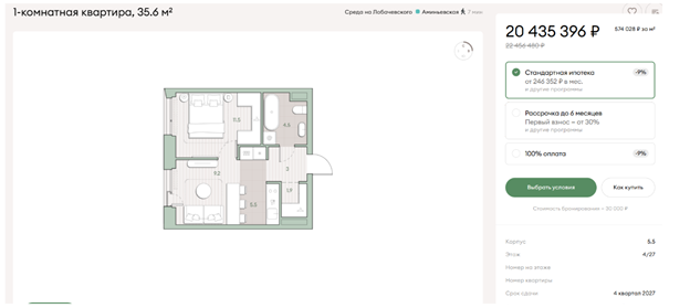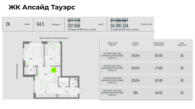 Огромный проект от структур РЖД. Квартира за 37 млн ₽. Банки предлагают траншевую ипотеку: 0,1% на первый год, затем 19,9%, или 5% на 15 месяцев, затем 21,7%, но такие условия бессмысленны для долгосрочного кредитования. Единственный возможный сценарий использования — фиксация цены и планировки на время продажи имеющейся вторичной недвижимости.