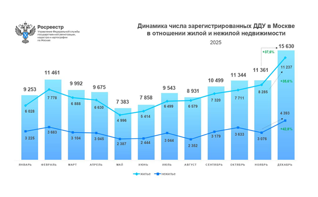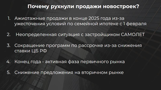 После корректировки семейной ипотеки с 1 февраля 2026 года ожидалось резкое снижение продаж на рынке недвижимости. Рынок в значительной степени зависит от льготных программ: семейной ипотеки, IT-ипотеки и других форм субсидирования. Начиная примерно с августа каждый месяц фиксировался рост продаж в Москве и Новой Москве. Эти данные также подтверждались статистикой Росреестр. В декабре было зарегистрировано около 15 тыс. сделок — это стало рекордным показателем.