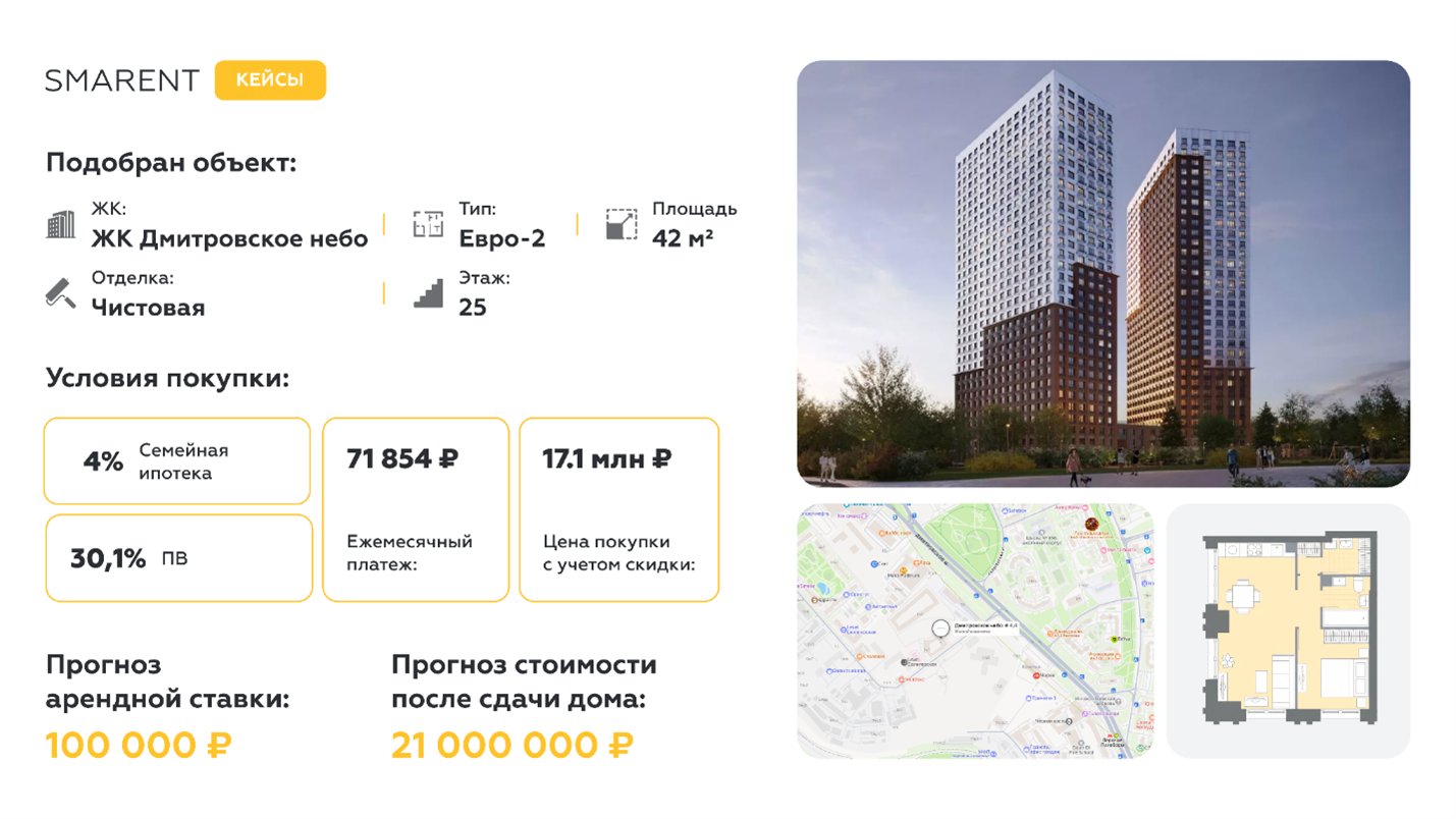 Особенность работы Smarent — комплексный сервис. После покупки квартиры компания помогает принять объект, найти подрядчиков для ремонта, выполнить меблировку и сдать квартиру в аренду через собственную управляющую компанию, обеспечивая стабильный денежный поток для инвестора.