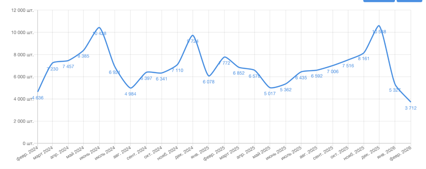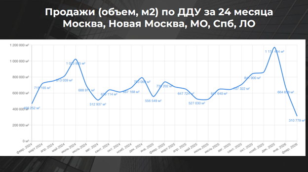 По другим данным, за февраль 2026 года в Москве и Новой Москве было продано всего около 3,7 тыс. квартир, сделки распределяются примерно на 400 жилых комплексов. Фактически получается, что в среднем один проект продает около 10 квартир в месяц, что довольно мало для такого крупного рынка, как московский.