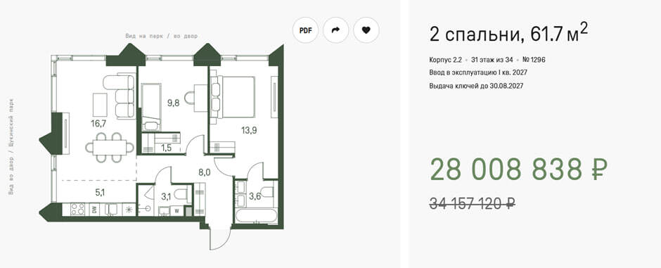 ЖК Moments предлагает хорошие планировки — здесь можно найти в том числе и форматы кухни-гостиной и углового окна. Самый оптимальный вариант для семьи из трех-четырех человек — квартира 60 м² с двумя спальными и двумя санузлами — то, что нужно для комфортного проживания. Цена за такое жилье — 28 млн рублей, из них 16 — первоначальный взнос.