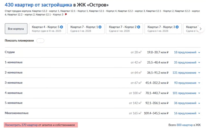 Основная проблема «Острова», как и большинства проектов в Большом Сити, — это вторичный рынок. Каждая новая очередь становится дороже, ближе к воде и привлекательнее, а предыдущие очереди постепенно теряют ликвидность. Если посмотреть предложения, можно увидеть огромный объем квартир: сотни лотов от застройщика и по уступке.