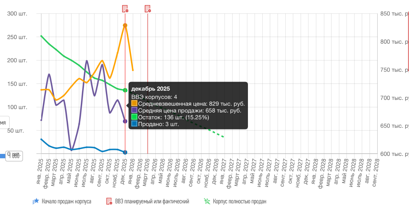 В январе застройщик зафиксировал, что в продаже осталось 136 квартир и апартаментов. Ввод в эксплуатацию запланирован на март 2026 года, а выдача ключей — на май 2026 года. При этом декабрь оказался крайне слабым по продажам — всего три сделки. Средневзвешенная цена по прайсу составляла около 829 тыс. ₽ за м², тогда как фактическая цена сделки была около 650 тыс. ₽ за м². Рынок явно не принимал такие уровни.