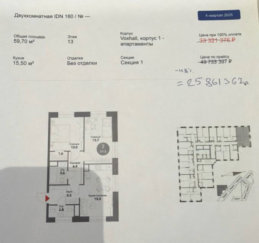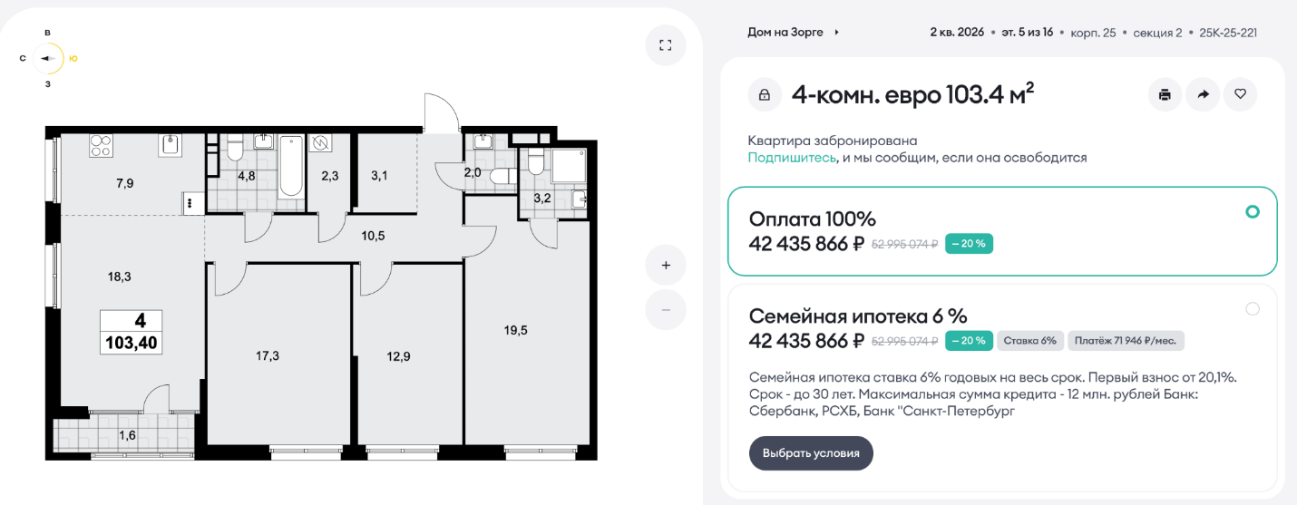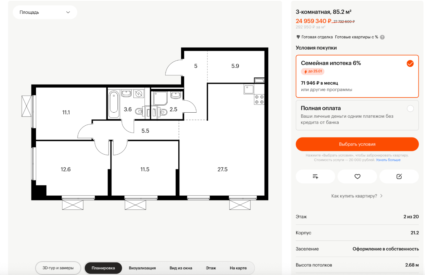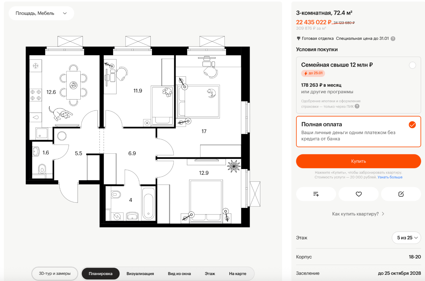 Большинство застройщиков сегодня используют фактически один инструмент — снижение цены. В первую очередь это касается крупных квартир. Так, объекты площадью около 106 м², ранее продававшиеся за 62 млн ₽, теперь предлагаются за 40 млн ₽. Формально это выглядит как существенная скидка, однако даже такая цена остаётся недоступной для массового покупателя. Дополнительно усложняет ситуацию отсутствие рассрочек и субсидированных ставок: покупка возможна либо при 100% оплате, либо с использованием рыночной ипотеки под ~17%, что делает кредит крайне дорогим.