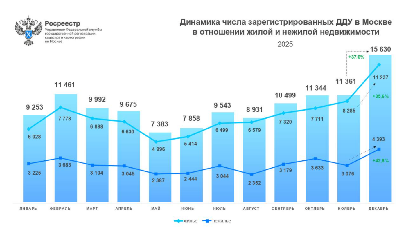 По данным Росреестра, в декабре было зарегистрировано 15 630 сделок в новостройках — показатель, нехарактерный для всего 2025 года. На рынок массово выходили сделки формата «студия 17 м² за 18 млн ₽». Девелоперы активно распродавали небольшие лоты, в том числе в непремиальных локациях, по ценам около 12 млн ₽. Дополнительное давление создаёт риск штрафов за просрочку ввода — до 60 млрд ₽ в год.