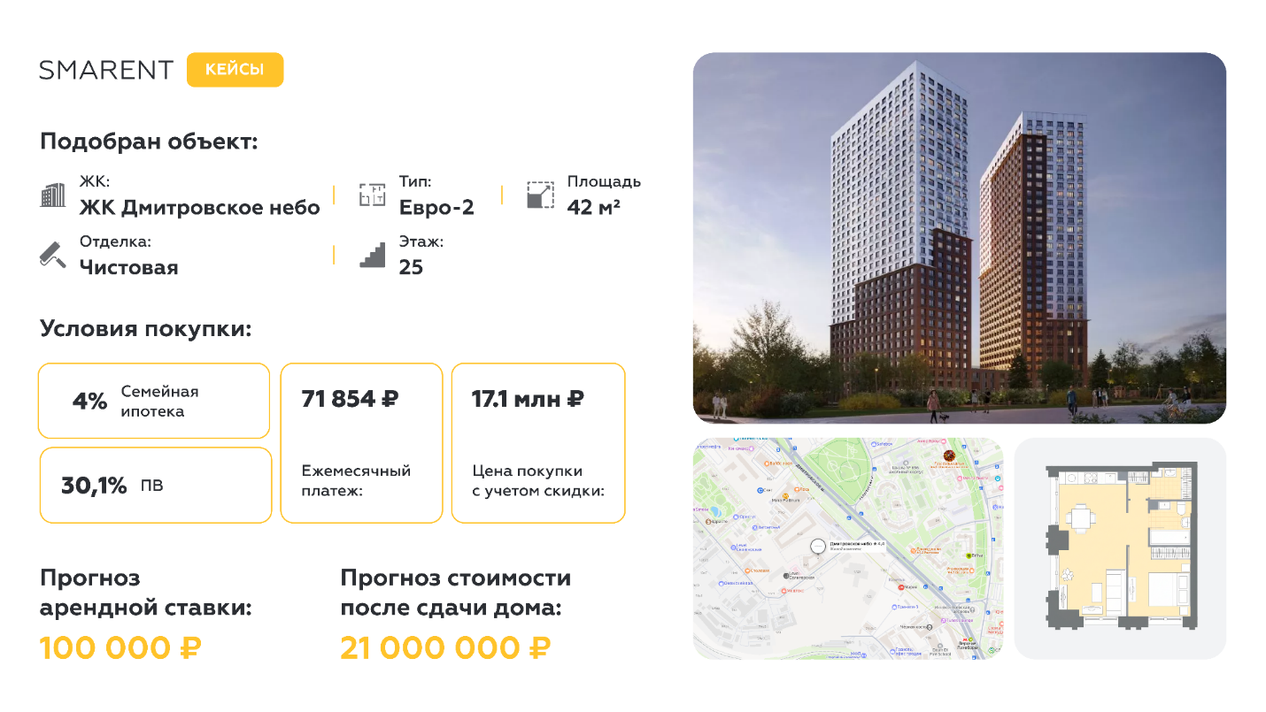 На практике это хорошо видно на реальных кейсах. Например, при подборе через Smarent был приобретён объект стоимостью 17 млн ₽ с готовой отделкой. Ежемесячный платёж составил около 72 тыс. ₽ при субсидированной ставке 4% и первоначальном взносе 30%. В аренде такая квартира может приносить порядка 90 тыс. ₽ в месяц, чего достаточно для покрытия ипотечного платежа, коммунальных услуг и сопутствующих расходов. В результате арендатор фактически выплачивает стоимость объекта.