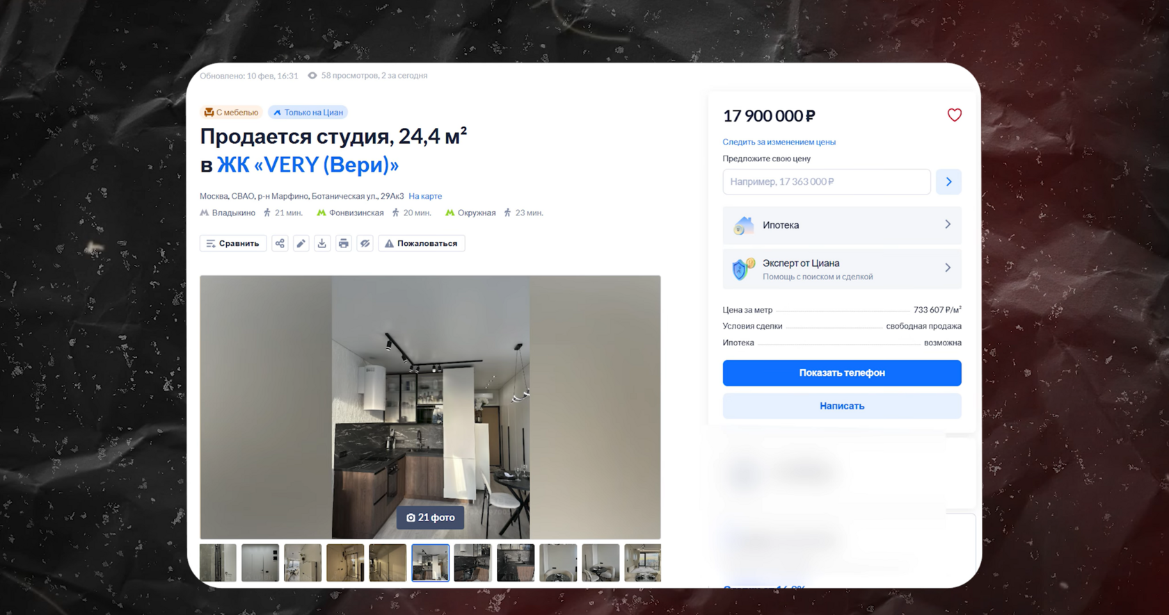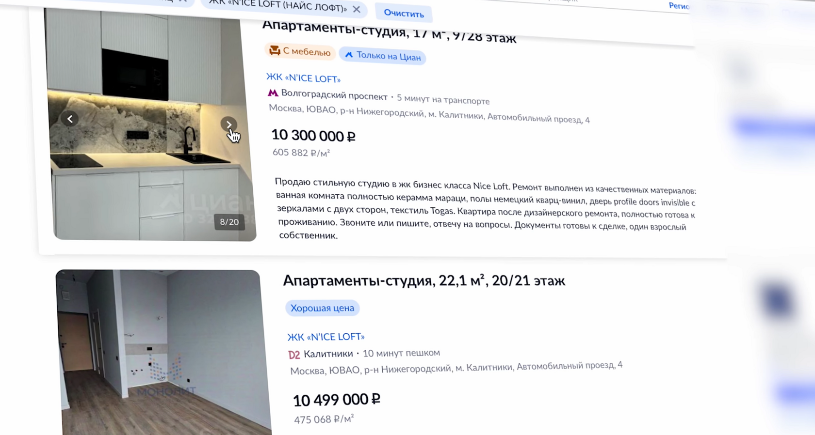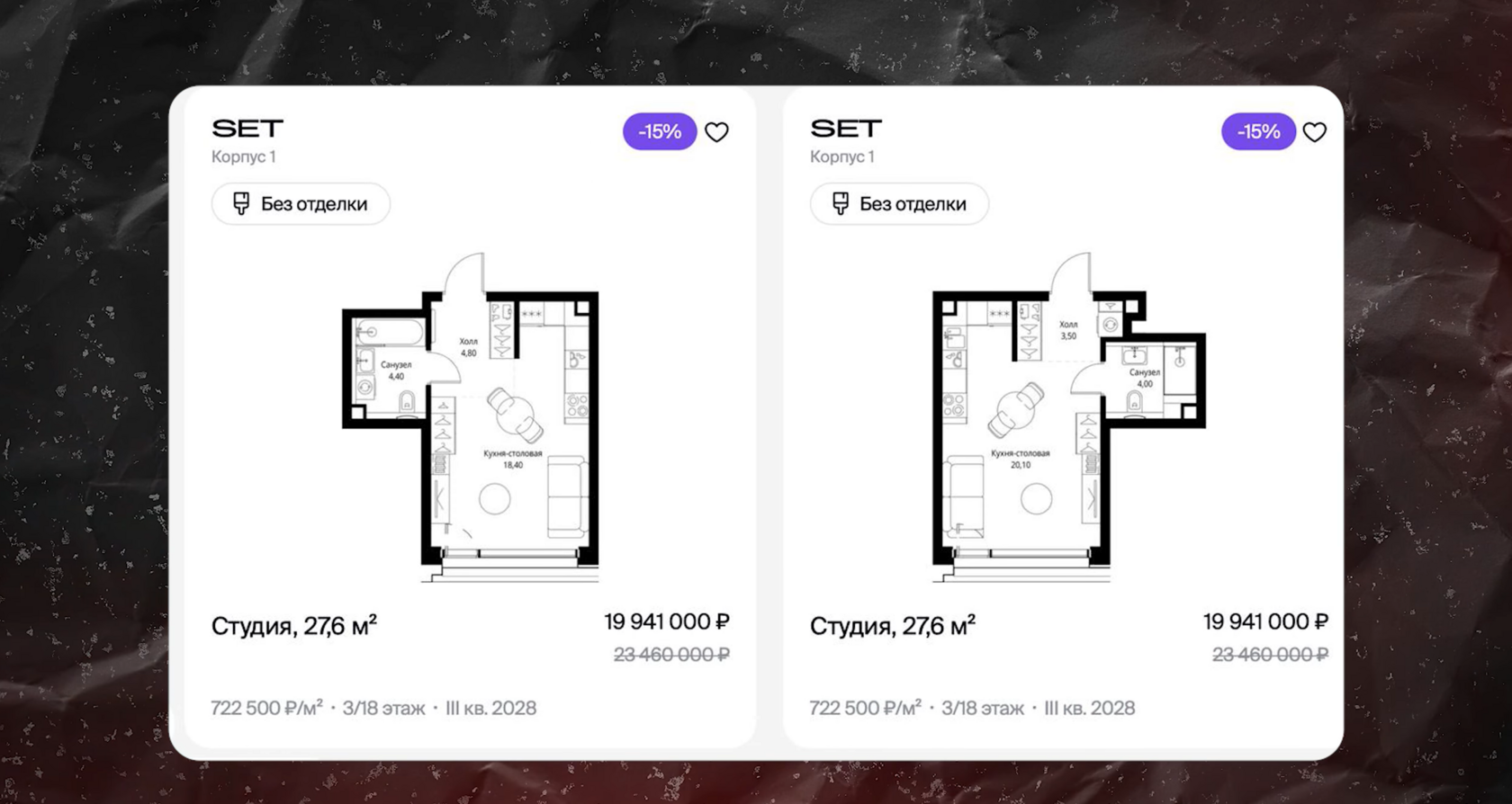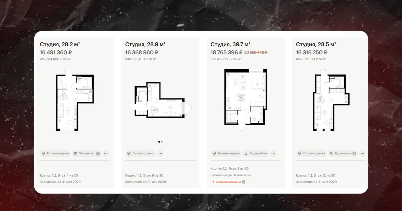 Кроме того, цены на студии удивляют. Квартира-студия за 18 млн ₽ — не гипотеза, а реальный кейс. Например, MR предлагает объекты по 18–19 млн ₽. Формально в ДДУ указывается однокомнатная квартира, поскольку юридически студий в российском законодательстве не существует. В Москва минимальная площадь таких объектов — от 27 м². Фактически речь идет о студии площадью 23–27 м² стоимостью 18–19 млн ₽. При этом годом ранее аналогичные лоты предлагались за 11–12 млн ₽.